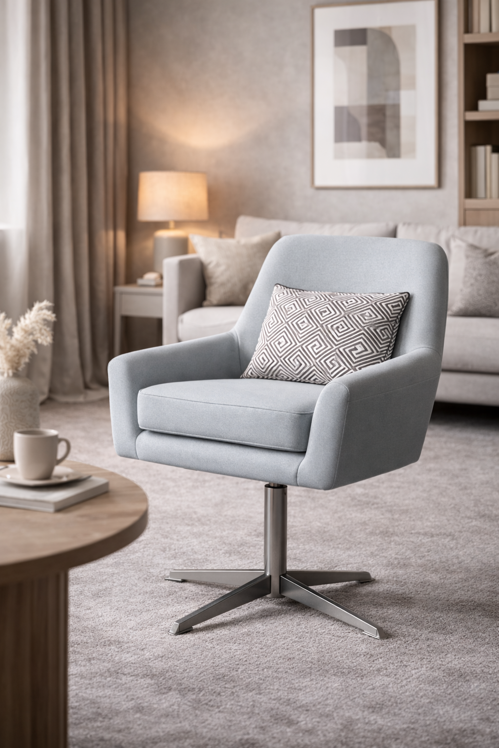 Стильное кресло на поворотном основании из нержавеющей стали. Кресло Denmark в скандинавском стиле – идеальное решение для рабочего места или небольшой гостиной. Уютное и эргономичное кресло впишется в любой современный интерьер.