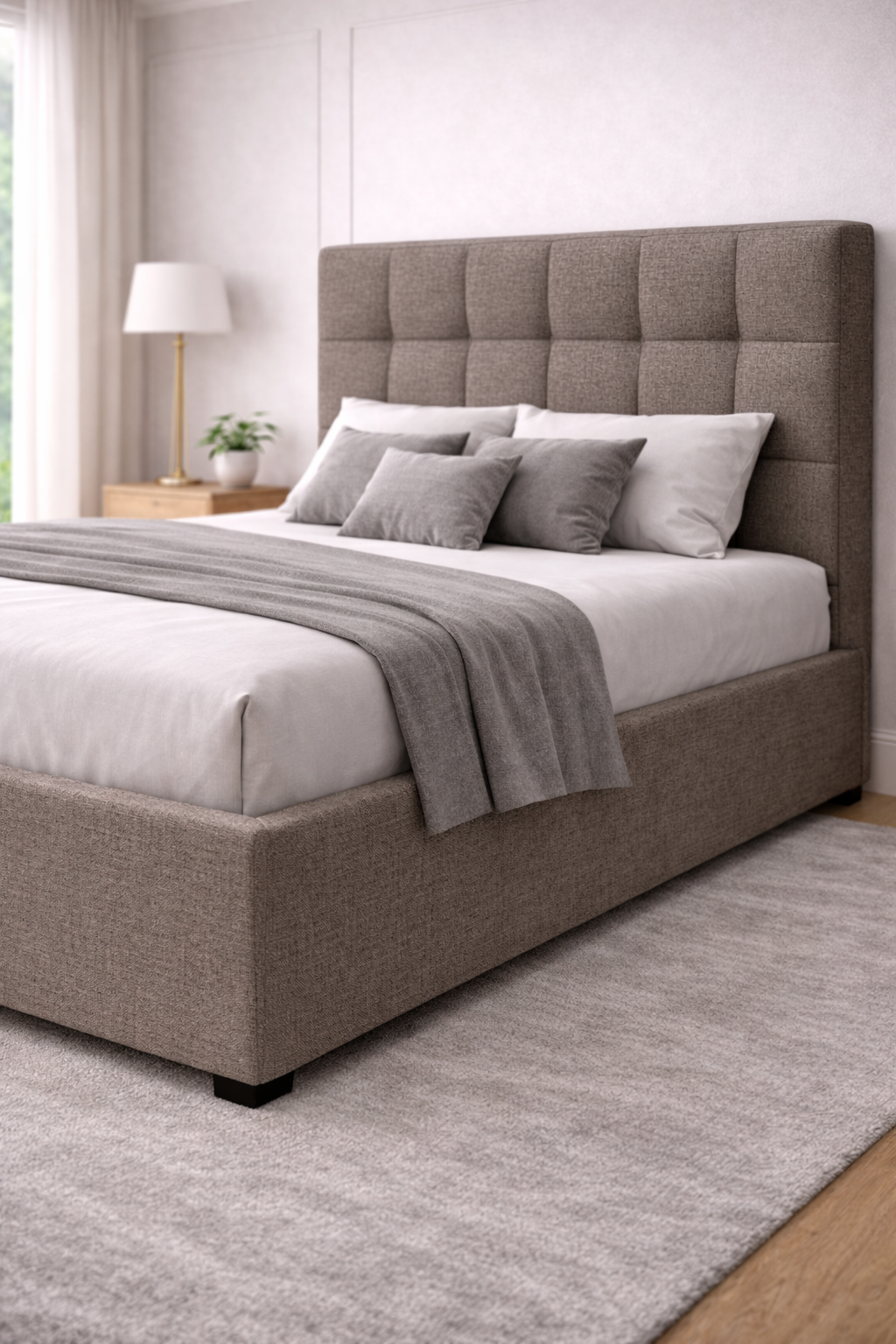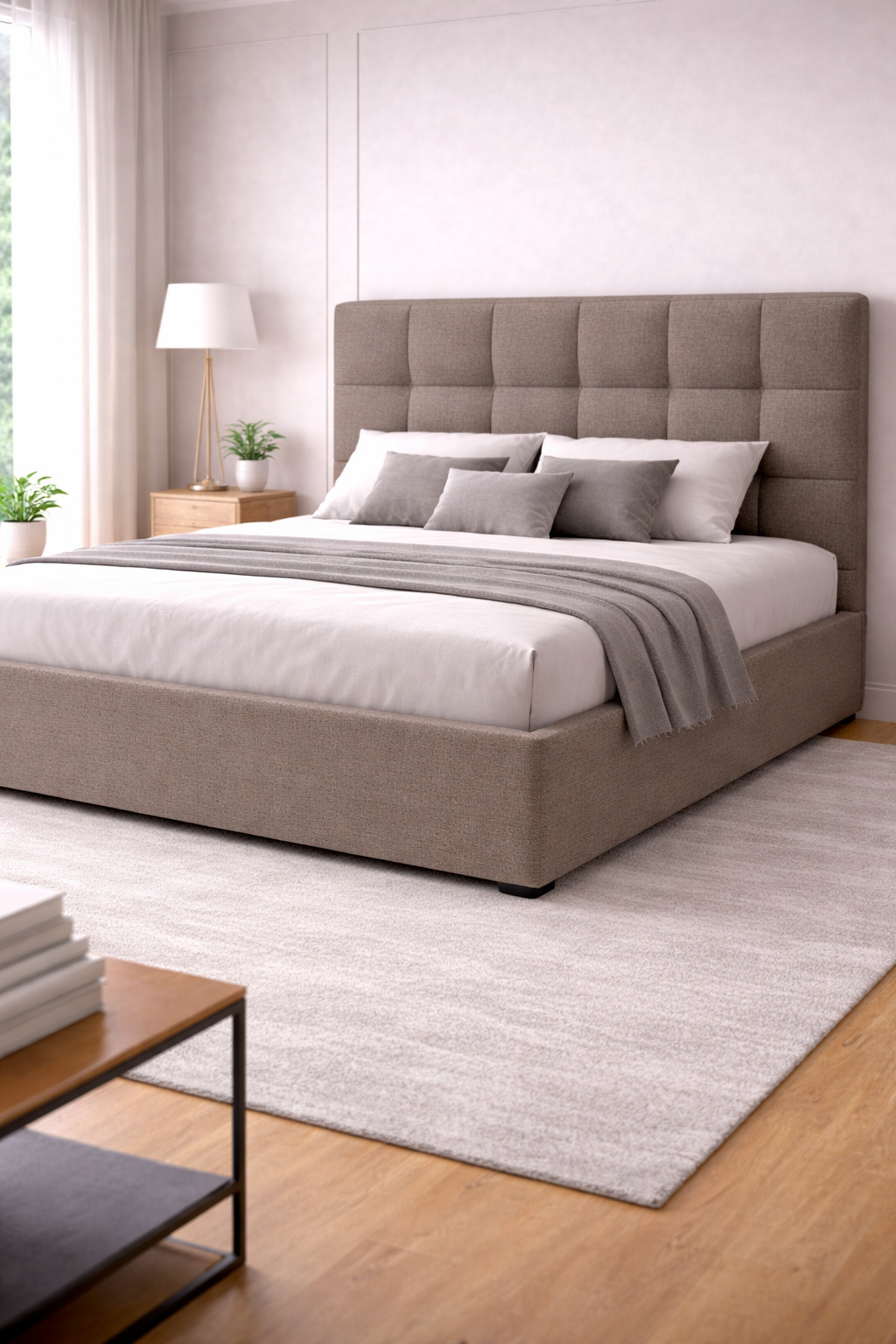 Простая форма изголовья Quadro Bed в сочетании c современной тканью  с актуальной стёжкой в виде крупных квадратов  придают кровати лаконичный и стильный вид.