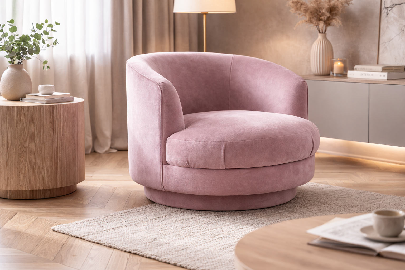 Компактное кресло Zefir станет уютным дополнением для гостиной или спальни. Форма кресла очень универсальна – его можно расположить в любой части комнаты. Круглое кресло непременно добавит интерьеру изящности и индивидуальности.